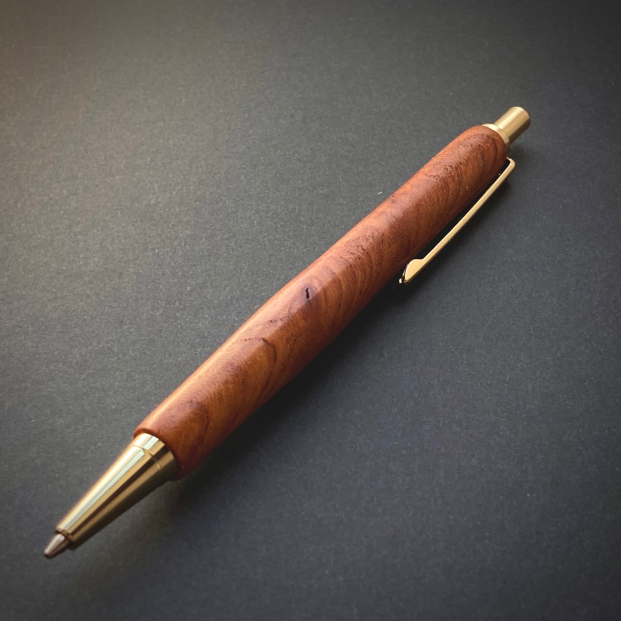 (フィニッシュ):亜麻仁油とシェラックで仕上げました。すごく薄く塗って、磨いて、乾燥させる。この工程を7-8回繰り返してあるので、フィニッシュだけでも、ただオイルを塗ってほっとくではなく、手間暇かけての仕上げ。木軸グリップのフィニッシュとしては日本ではあまり見かけないフィニッシュです。