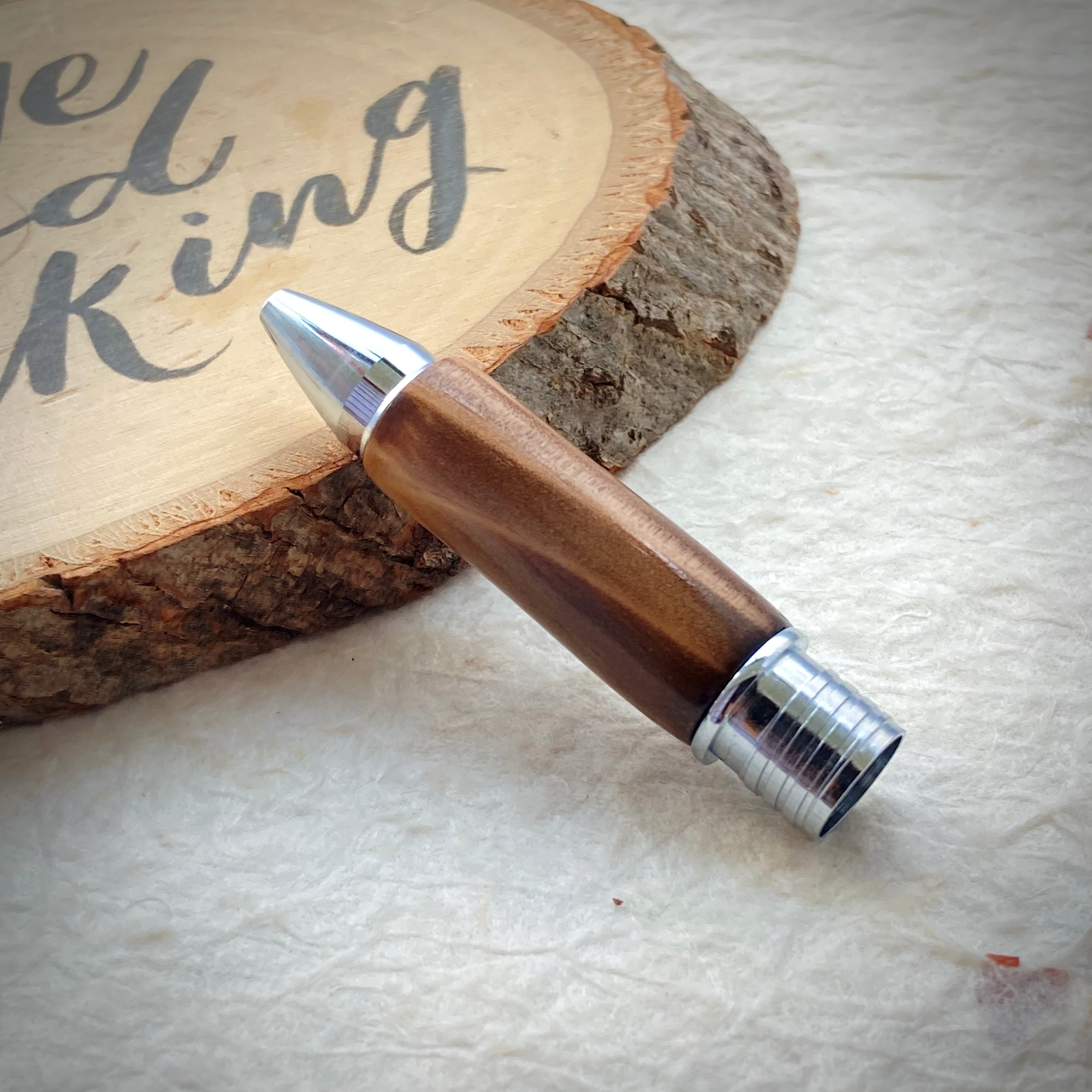 (フィニッシュ):亜麻仁油とシェラックで仕上げました。すごく薄く塗って、磨いて、乾燥させる。この工程を7-8回繰り返してあるので、フィニッシュだけでも、ただオイルを塗ってほおっておくのではなく、手間暇が1日以上かかっています。木軸グリップのフィニッシュとしては日本ではあまり見かけないフィニッシュです。