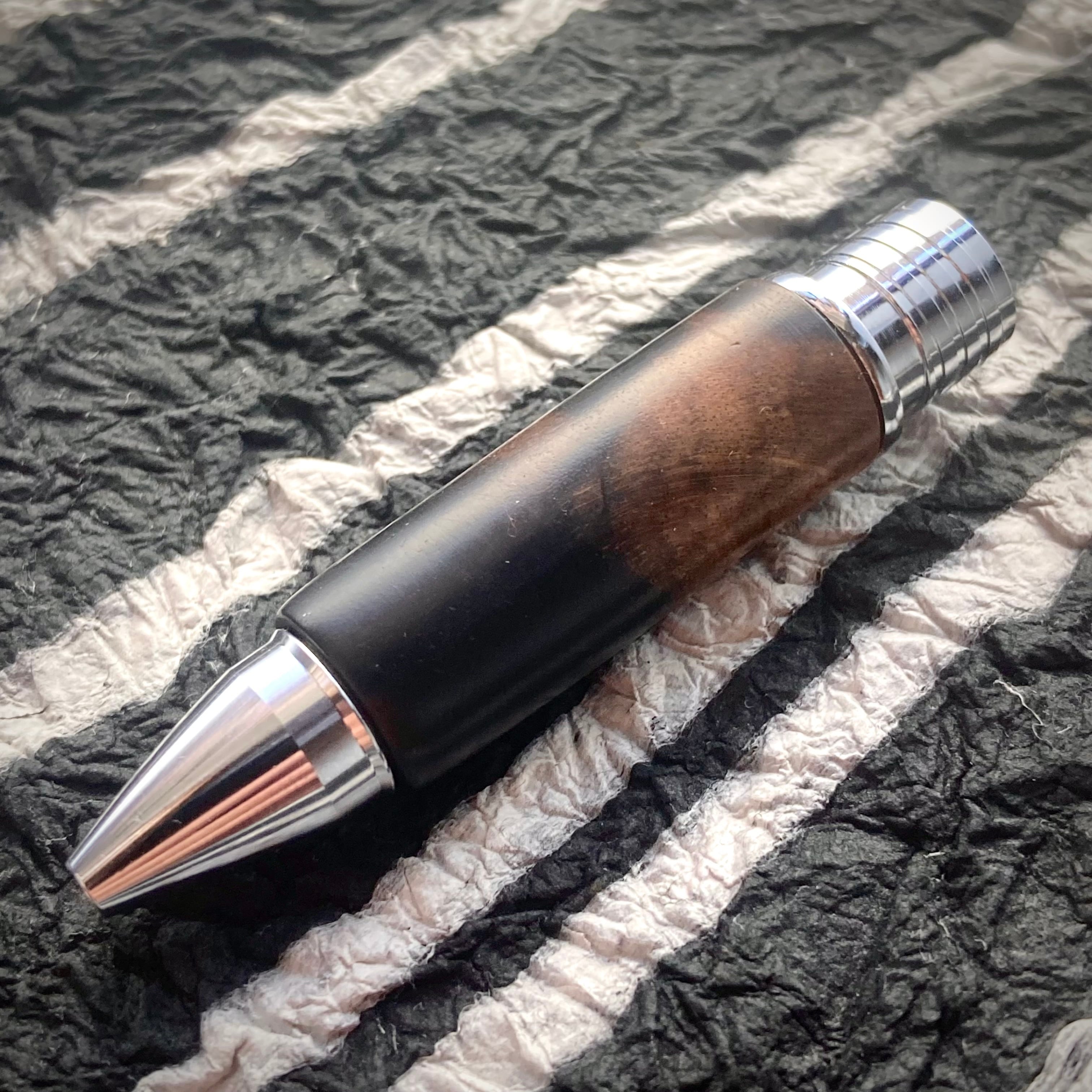 (フィニッシュ):亜麻仁油とシェラックで仕上げました。すごく薄く塗って、磨いて、乾燥させる。この工程を7-8回繰り返してあるので、フィニッシュだけでも、ただオイルを塗ってほおっておくのではなく、手間暇が1日以上かかっています。木軸グリップのフィニッシュとしては日本ではあまり見かけないフィニッシュ。