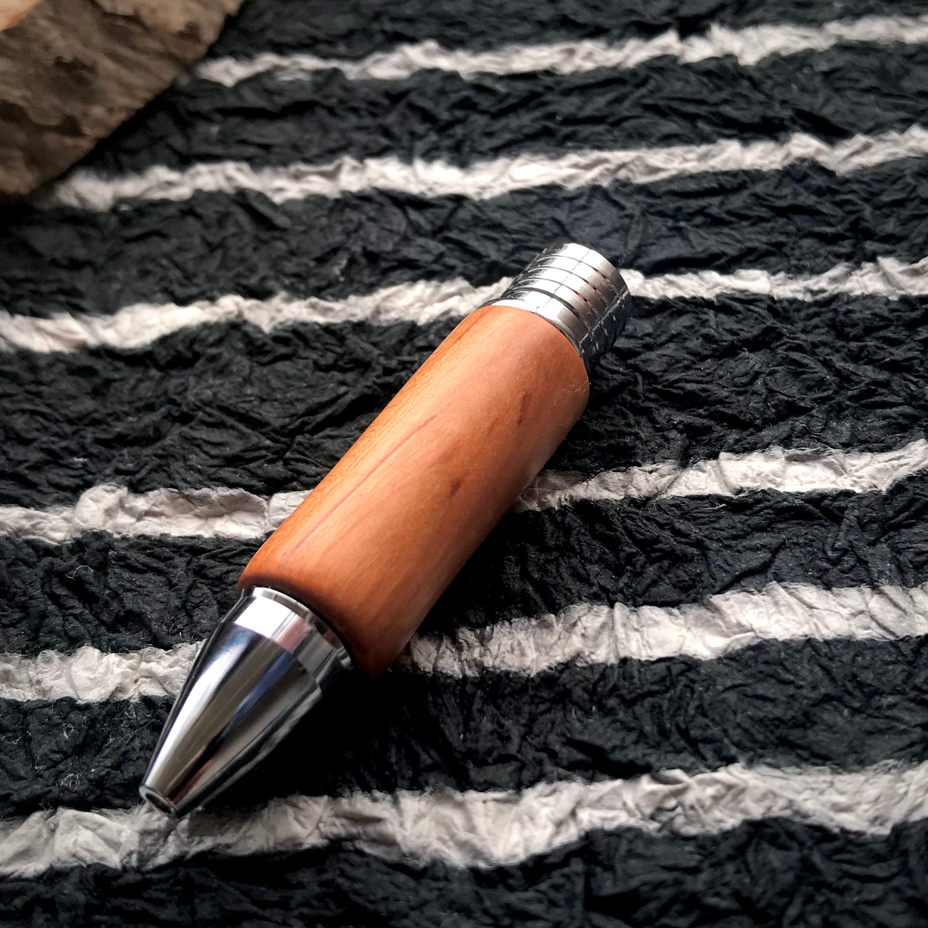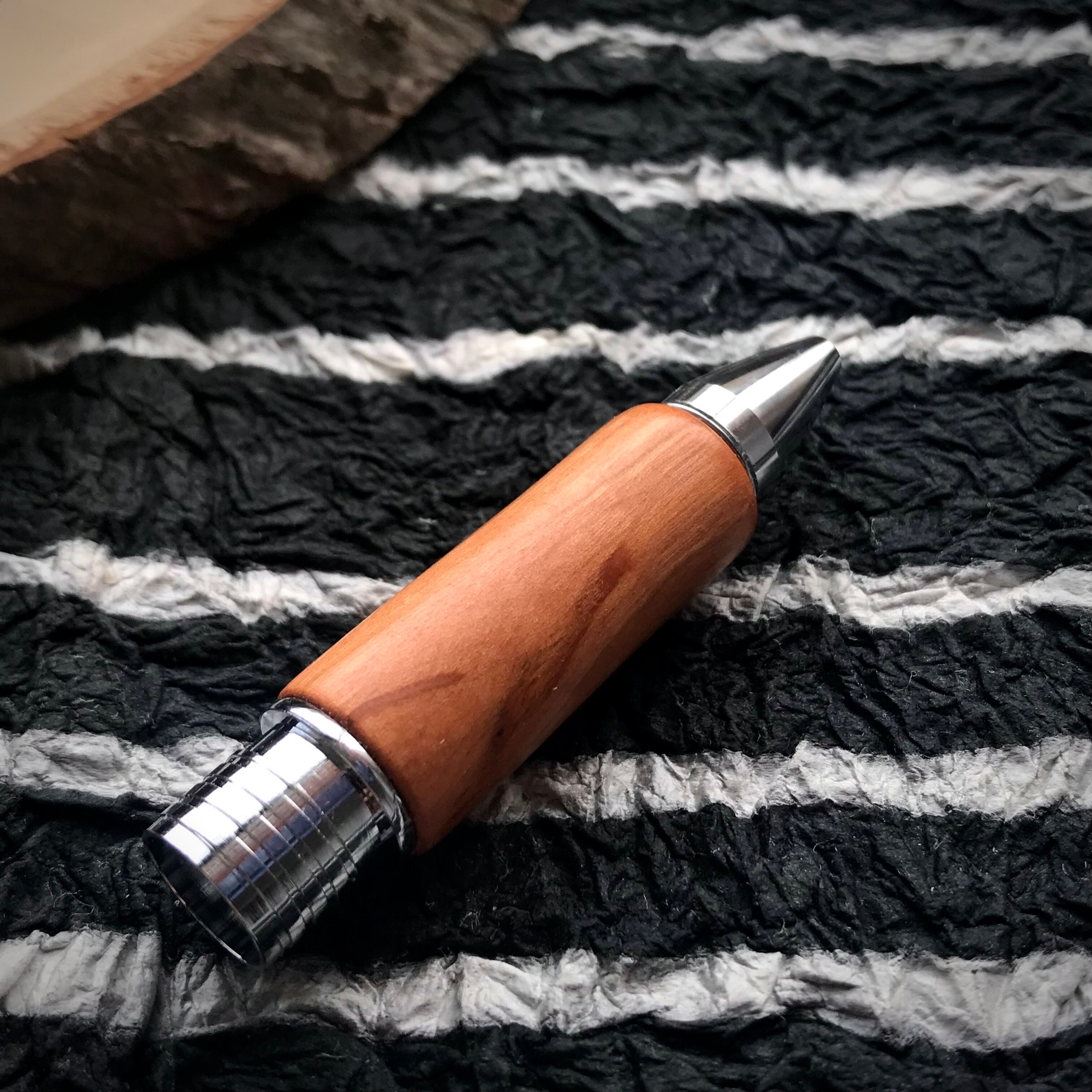 (フィニッシュ):亜麻仁油とシェラックで仕上げました。すごく薄く塗って、磨いて、乾燥させる。この工程を7-8回繰り返してあるので、フィニッシュだけでも、ただオイルを塗ってほおっておくのではなく、手間暇が1日以上かかっています。木軸グリップのフィニッシュとしては日本ではあまり見かけないフィニッシュ。