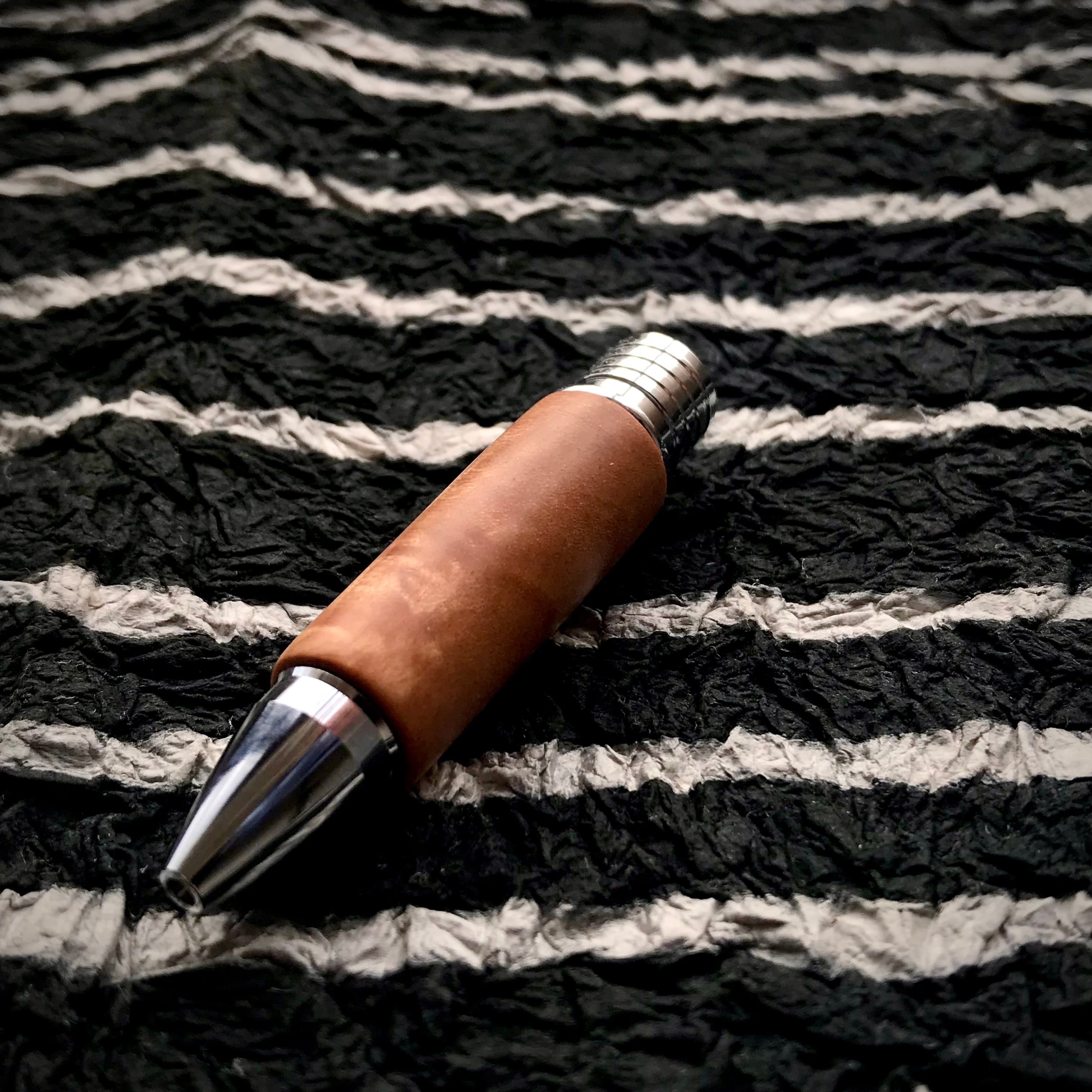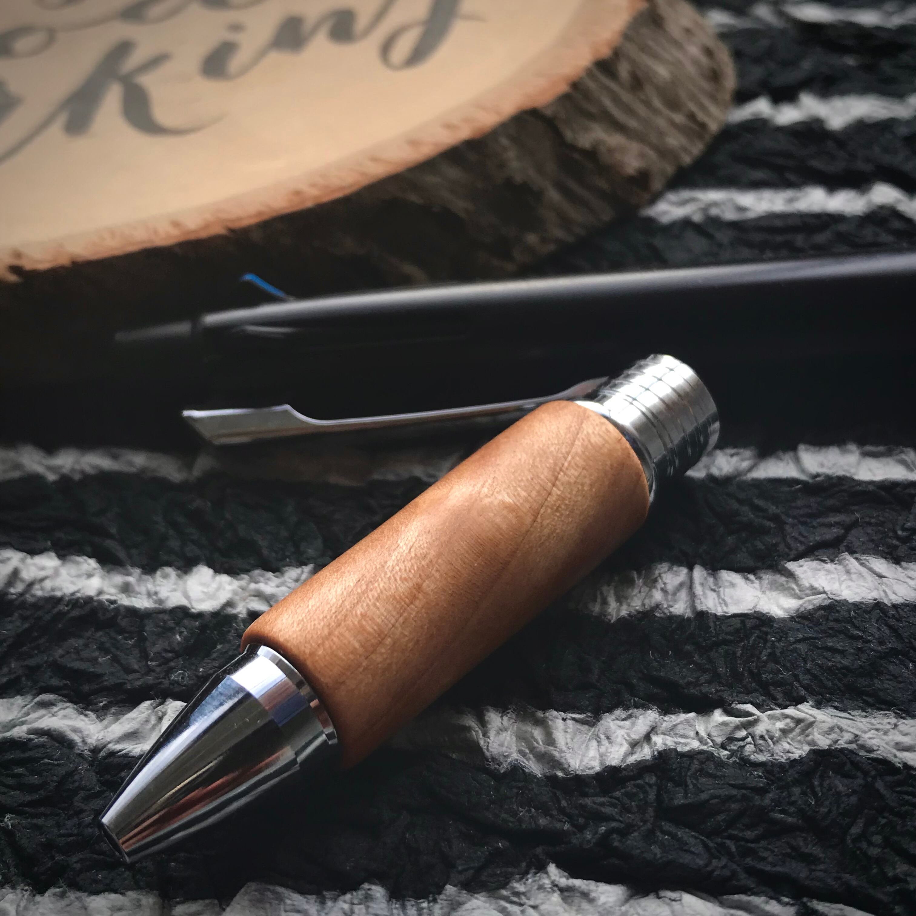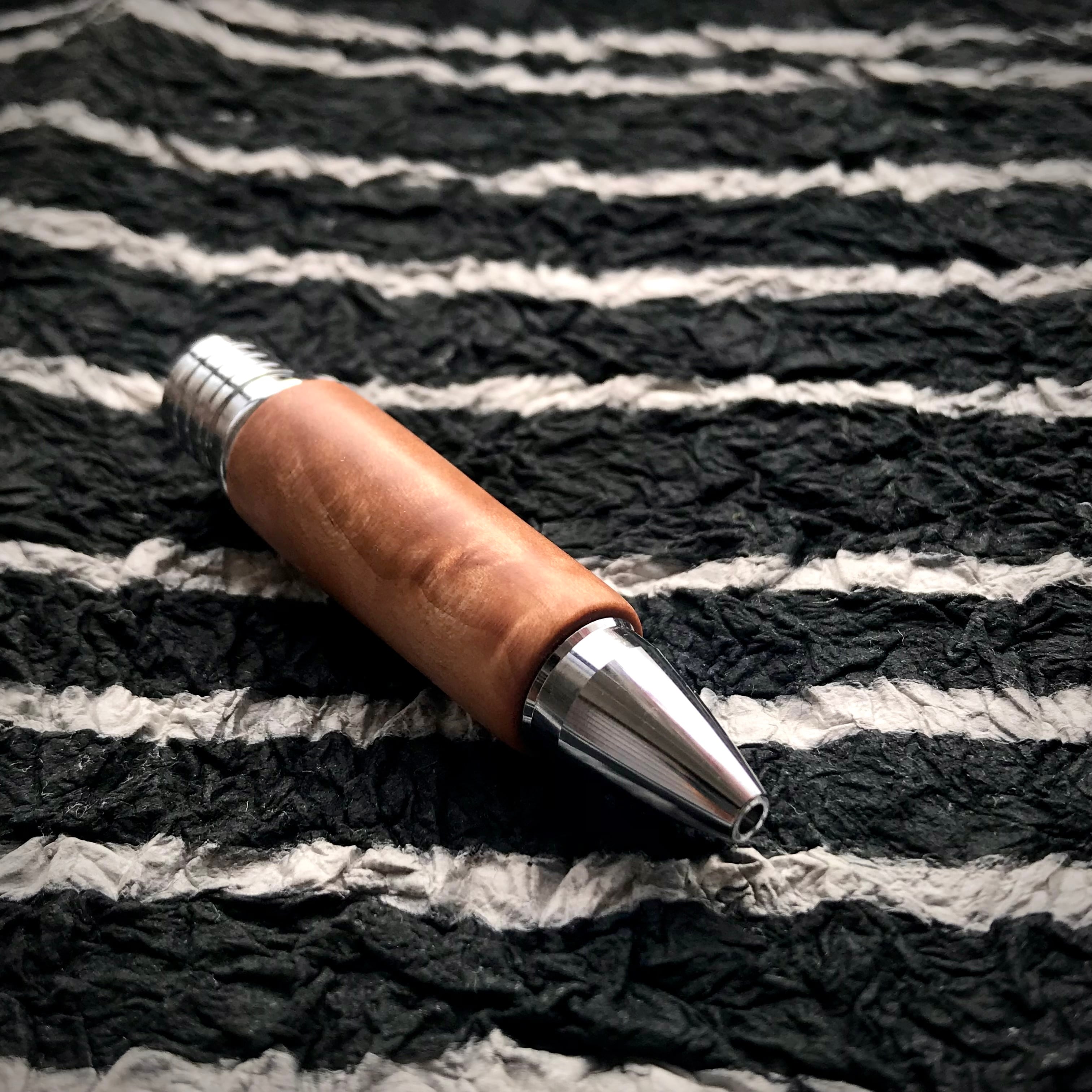 (フィニッシュ):亜麻仁油とシェラックで仕上げました。すごく薄く塗って、磨いて、乾燥させる。この工程を7-8回繰り返してあるので、フィニッシュだけでも、ただオイルを塗ってほおっておくのではなく、手間暇が1日以上かかっています。木軸グリップのフィニッシュとしては日本ではあまり見かけないフィニッシュ。