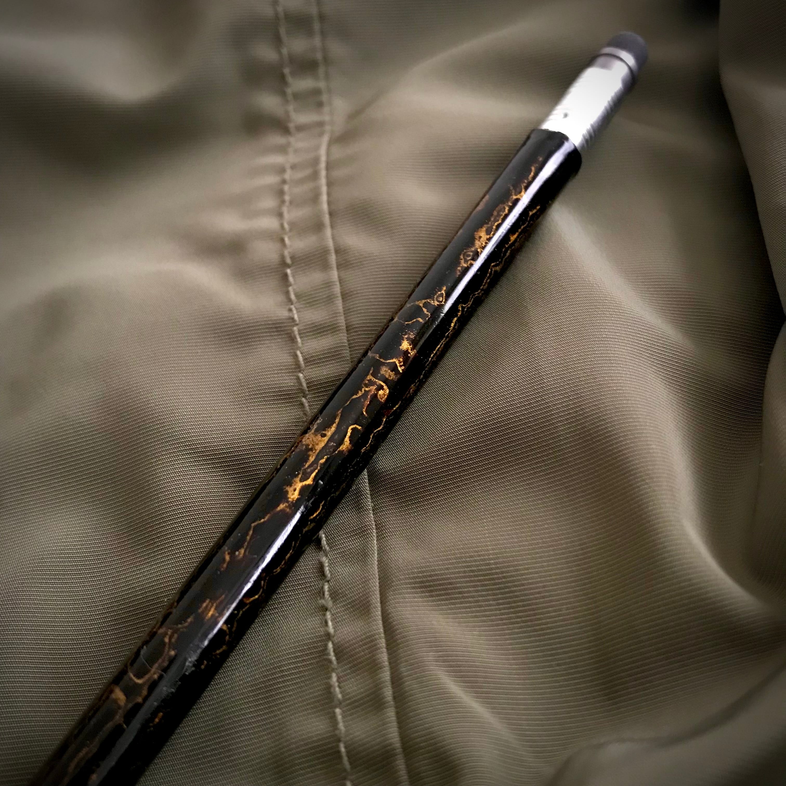 (特徴/フィニッシュ):今回はゴールドラインを本黒漆塗りで仕上げてみました。(金価格高騰なので、本物ではないです)。漆ならではの柔らかすぎず、硬すぎずの心地よい握り心地を味わうことができます。長く使っていても疲れにくいです。元々の六角軸はプラスチックやメタルではなく、木材です。