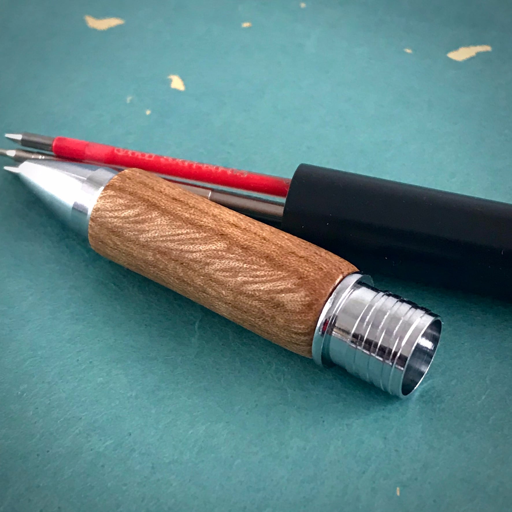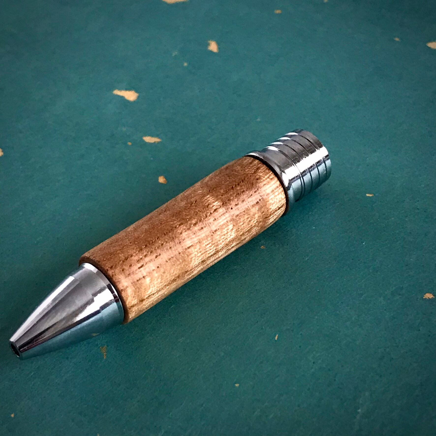 亜麻仁油とシェラックで仕上げました。すごく薄く塗って、磨いて、乾燥させる。この工程を7-8回繰り返してあるので、フィニッシュだけでも、ただオイルを塗ってほおっておくのではなく、手間暇が1日以上かかっています。木軸グリップのフィニッシュとしては日本ではあまり見かけないフィニッシュ。